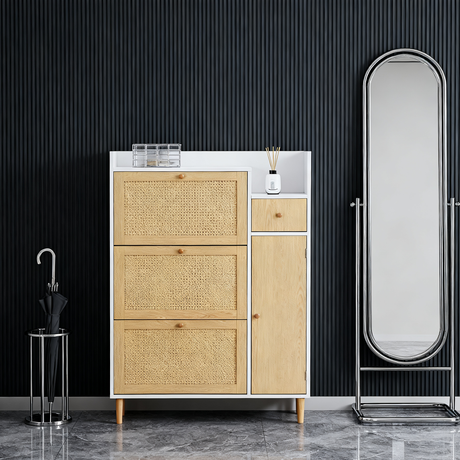 Meuble à chaussures en noyer 60x24x110 cm avec 2 portes en rotin, 1 tiroir et étagères réglables