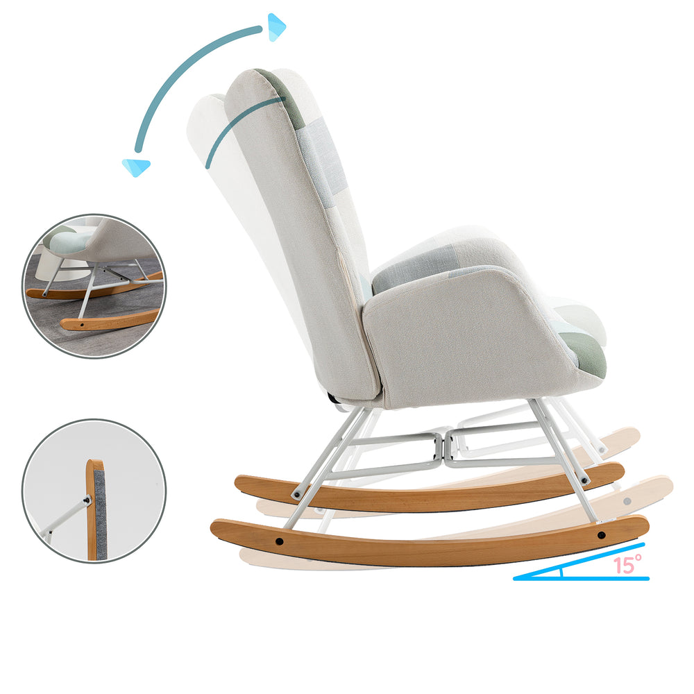 Fauteuil à bascule allaitement scandinave avec accoudoirs en tissu patchwork aqua capitonné - EPPING