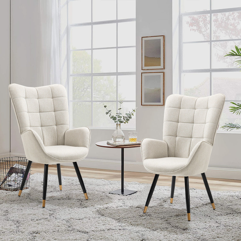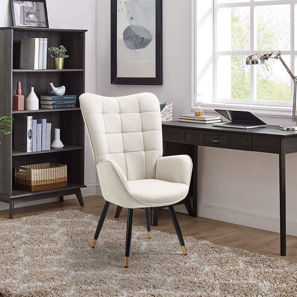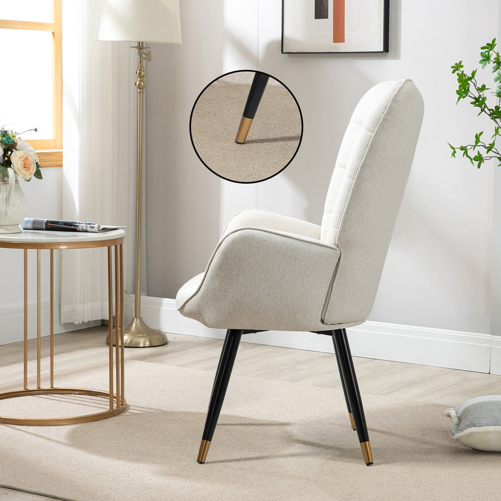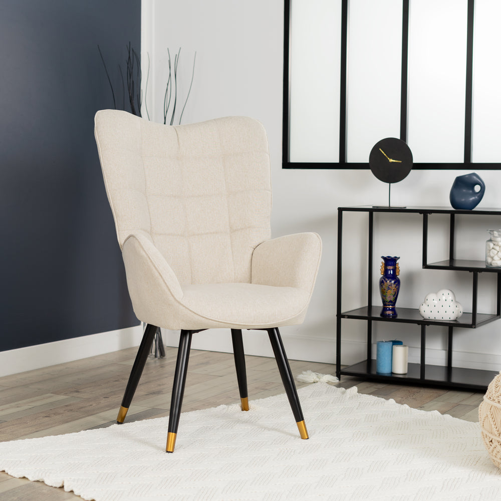 Ce fauteuil scandinave en tissu beige est l’alliance parfaite entre élégance naturelle et confort moderne. Son dossier capitonné, ses lignes épurées et ses pieds en métal noir et or apportent une touche chic et chaleureuse à tout intérieur.