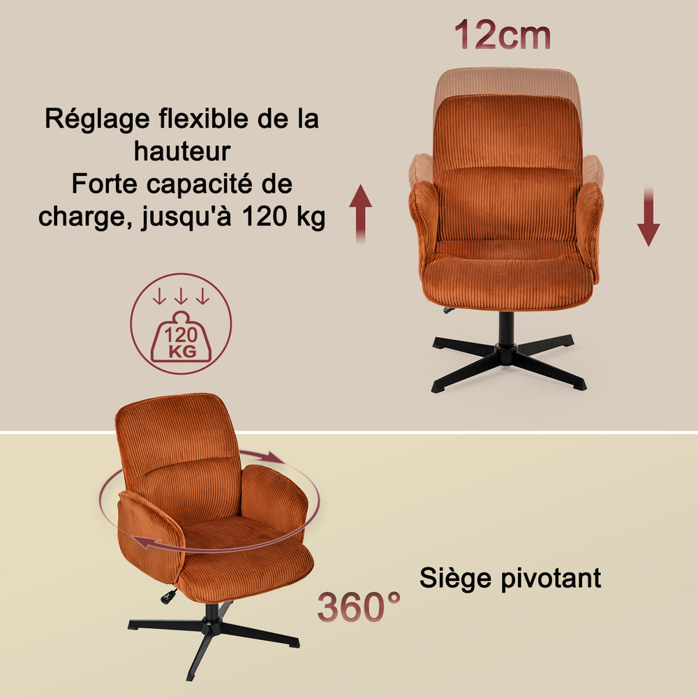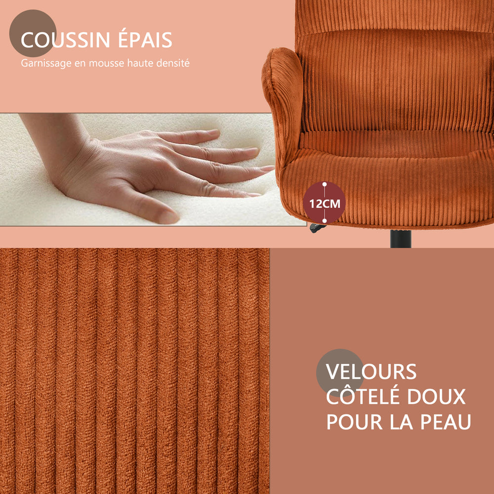 Fauteuil de bureau ergonomique pivotant et réglable avec accoudoirs en velours côtelé rouge - THOMASINA