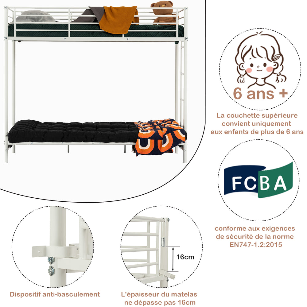 - Structure métallique robuste : Fabriqué en métal avec des lattes renforcées, supportant jusqu'à 120 kg pour le lit supérieur et 240 kg au total pour le lit inférieur.