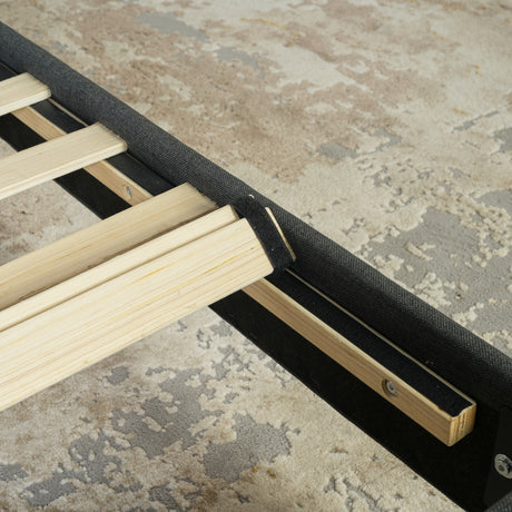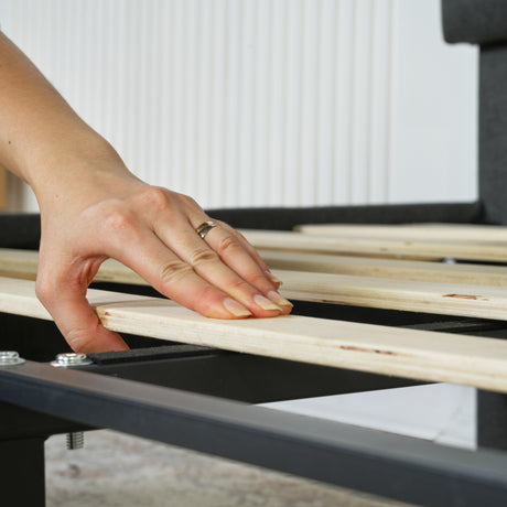 Lit double (140 x 190cm) avec tête de lit capitonnée en tissu gris (matelas non inclus) - LEON