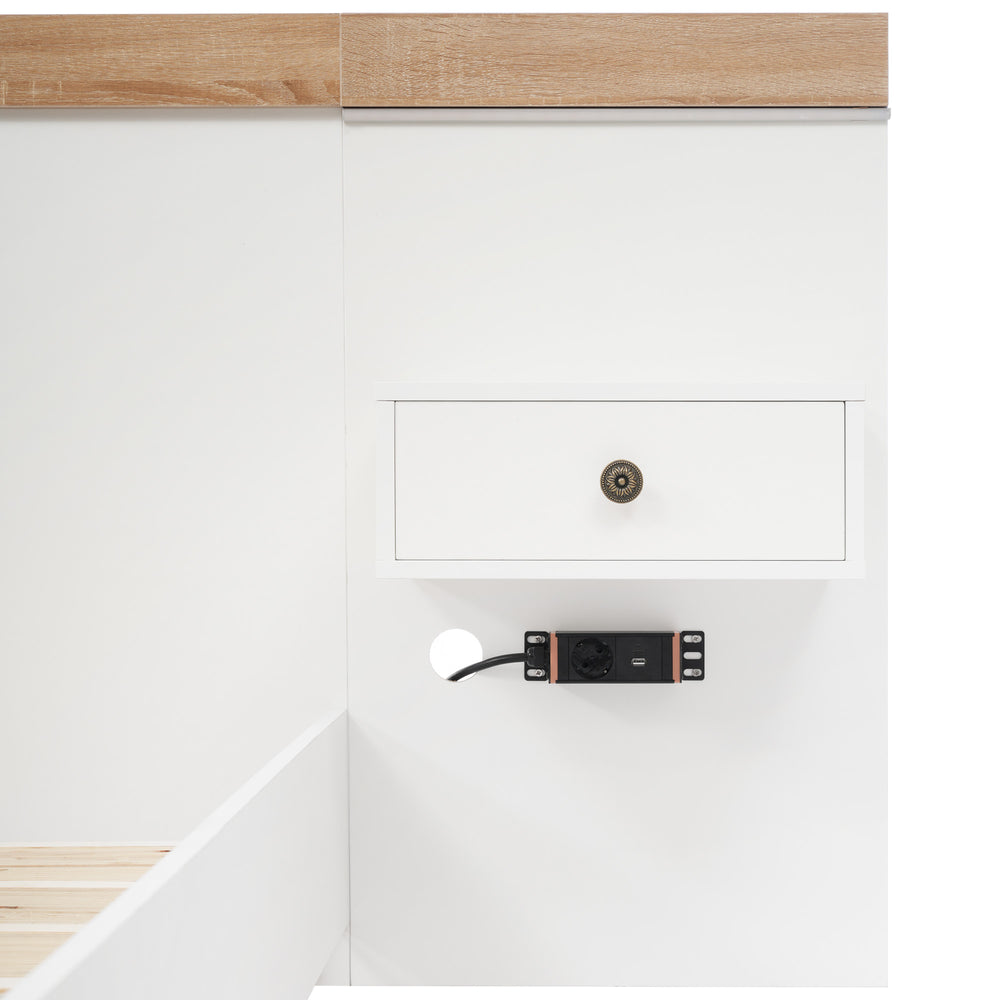 Ce lit double complet de 140x200 cm est la solution idéale pour une chambre moderne et fonctionnelle. Il est livré avec deux tables de chevet intégrées équipées de LED et de ports USB-C, parfaits pour charger vos appareils et créer une atmosphère cosy. Son design élégant en chêne sonoma et blanc, associé à une tête de lit spacieuse et à une structure robuste, offre confort, modernité et praticité au quotidien.