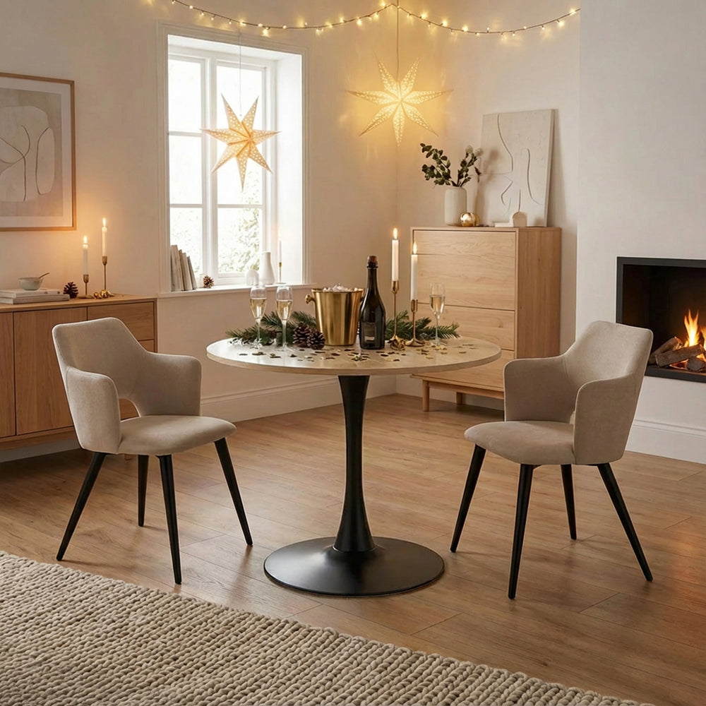- 2 places confortables : Table ronde de 80 cm de diamètre et 2 fauteuils rembourrés offrant un espace généreux pour les repas, les conversations ou le travail occasionnel.