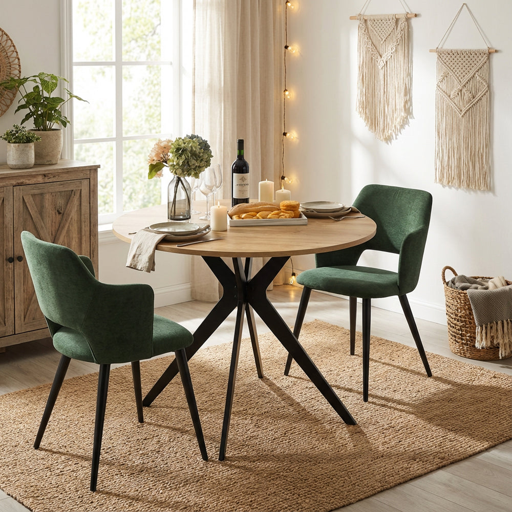 Ensemble table à manger ronde en chêne avec pieds en forme de X et 2 fauteuils en tissu vert de style scandinave pour salle à manger