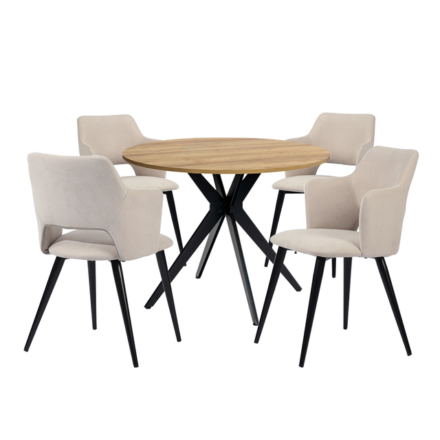 Ensemble table à manger ronde en chêne avec pieds en forme de X et 4 fauteuils en tissu beige de style scandinave pour salle à manger