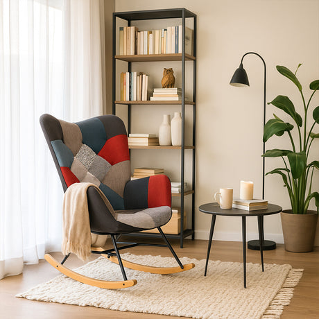 Fauteuil à bascule allaitement scandinave avec accoudoirs en tissu patchwork à surpiqûres - FUNKEL