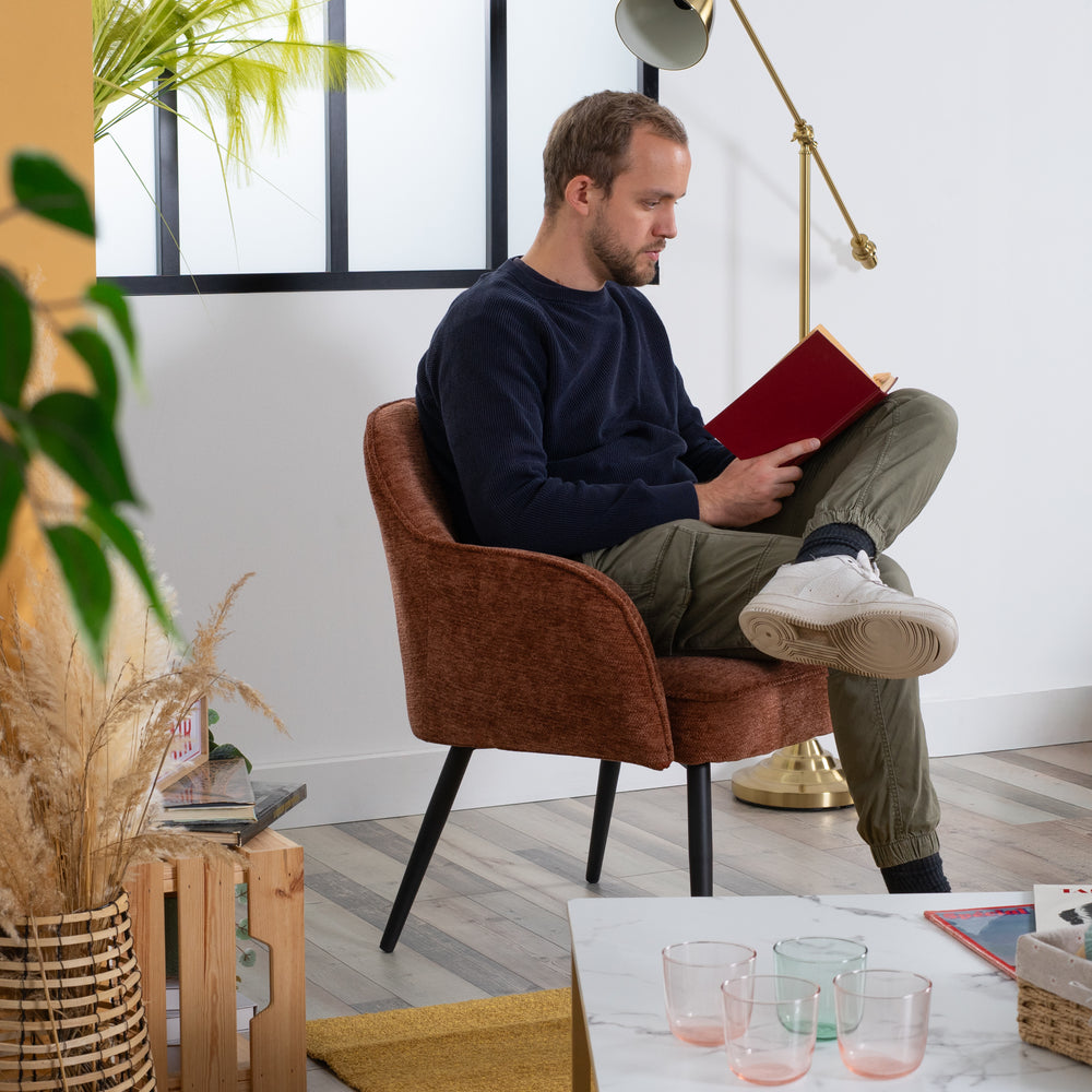 Compact et chaleureux, le fauteuil MARRIAM s’adapte à tous les espaces : fauteuil d’appoint dans un salon, coin lecture, chambre cosy ou salle d’attente. Son tissu chenille caramel apporte une touche tendance, douce et accueillante à votre décoration.