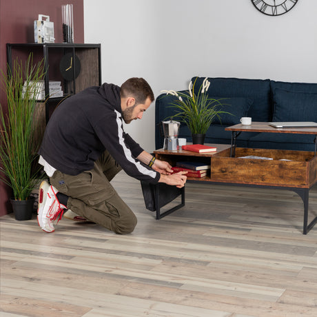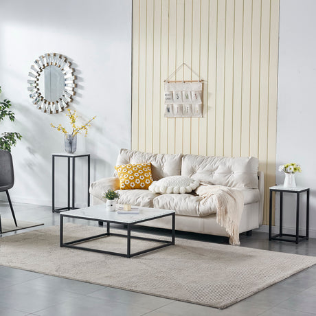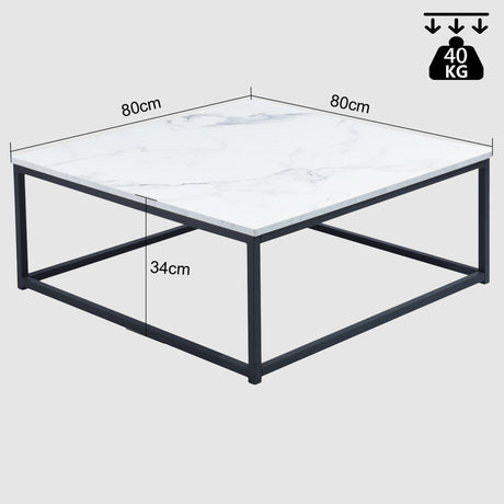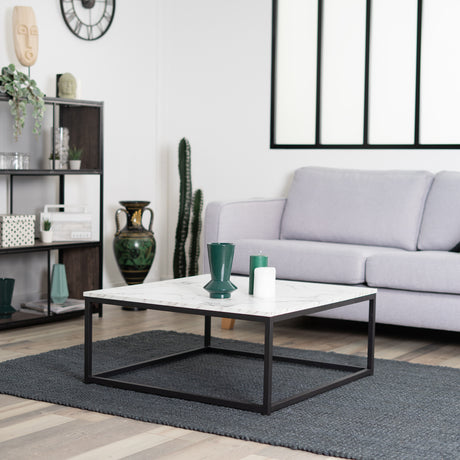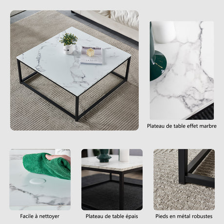 Table basse carrée style contemporain, plateau en bois effet marbre, structure en métal noir - FACTO