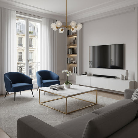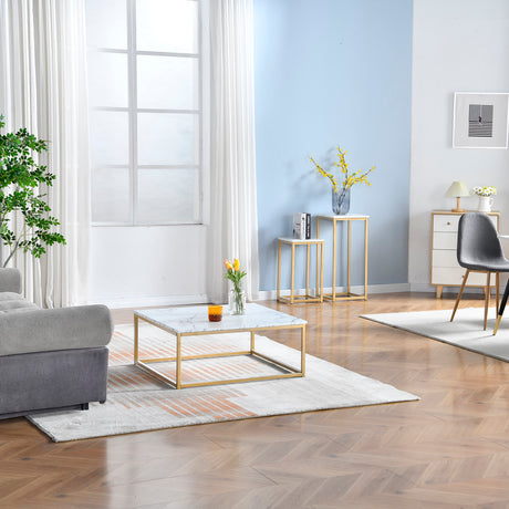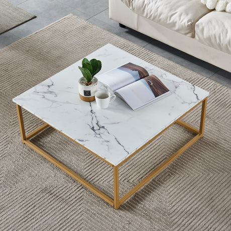 Table basse carrée style contemporain, plateau en bois effet marbre, structure en métal doré - FACTO