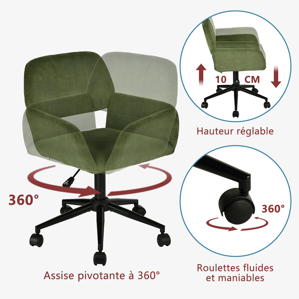 Apportez une note de fraîcheur et d’élégance naturelle à votre coin bureau avec ce duo composé d’un bureau pliable au style industriel et d’un fauteuil en velours côtelé vert olive. Compact et stylé, il s’adapte à tous les intérieurs.