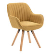 Bequeme Esszimmerstühle aus gelbem Stoff mit Armlehnen.