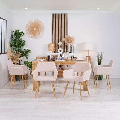479,99€609,99€Stückpreis /Nicht verfügbarSet mit 6 skandinavischen Esszimmersesseln mit Armlehnen aus beigem Stoff – AKANJI