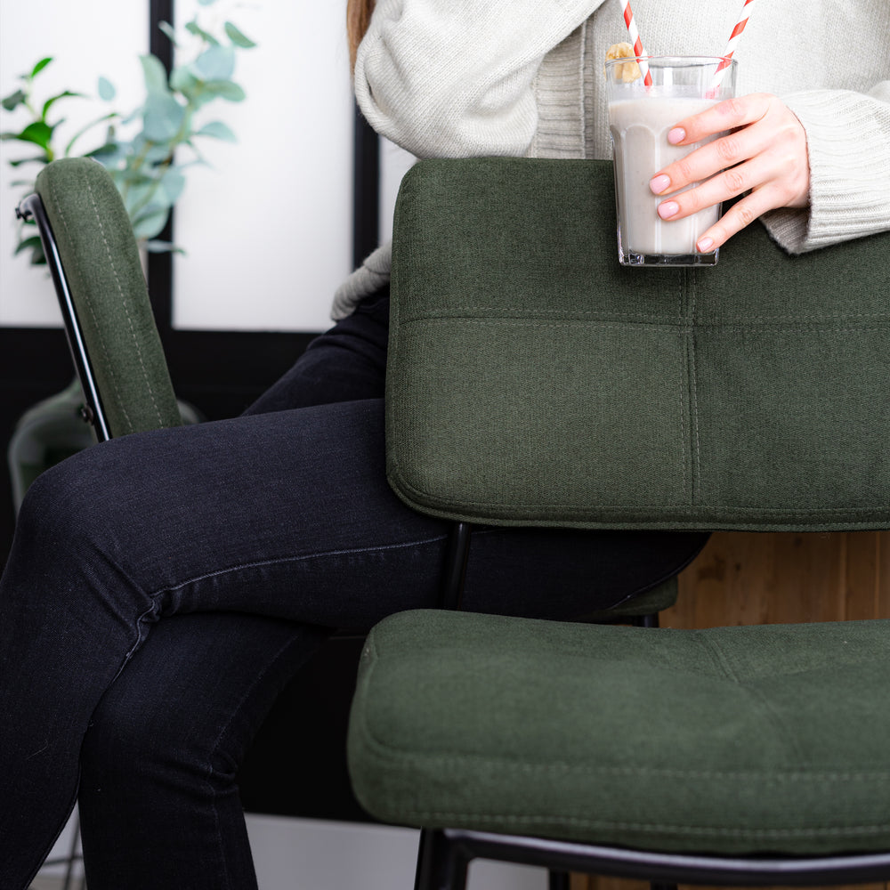 Set aus 2 industriellen Barhockern mit grüner Stoffrückseite – INDEPENDENCE BAR ist ausverkauft und wird versendet, sobald es wieder vorrätig ist.