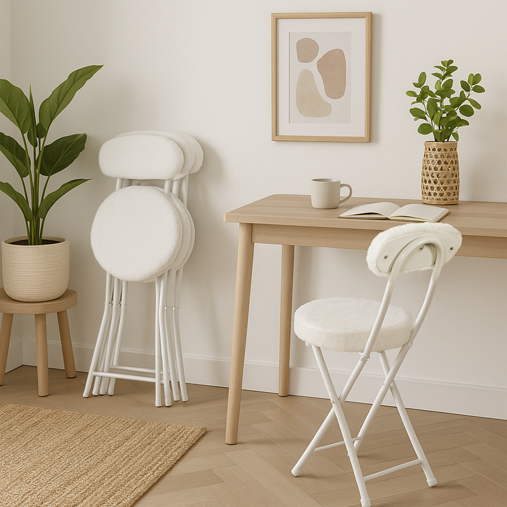 Kompakt, leicht und äußerst bequem: Diese weißen Klappstühle aus Kunstfell verwandeln jeden Raum im Handumdrehen in eine gemütliche Ecke. Mit ihrem minimalistischen Design und der weichen Haptik fügen sie sich nahtlos in moderne und klassische Innenräume ein und bieten gleichzeitig optimalen Komfort.