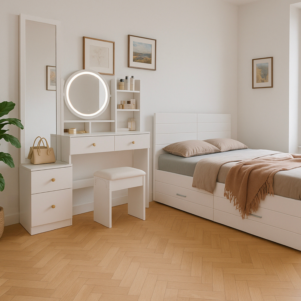 Bei Meubles Cosy bieten wir eine Reihe moderner Frisiertische und Möbel an, die Stil, Komfort und Funktionalität vereinen. Jedes Stück ist so konzipiert, dass es den täglichen Bedürfnissen gerecht wird und Ihrem Zuhause gleichzeitig eine elegante und moderne Note verleiht.