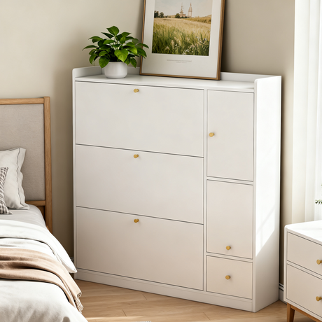 Meuble à chaussures noir 60x24x110 cm avec 2 portes en rotin, 1 tiroir et étagères réglables