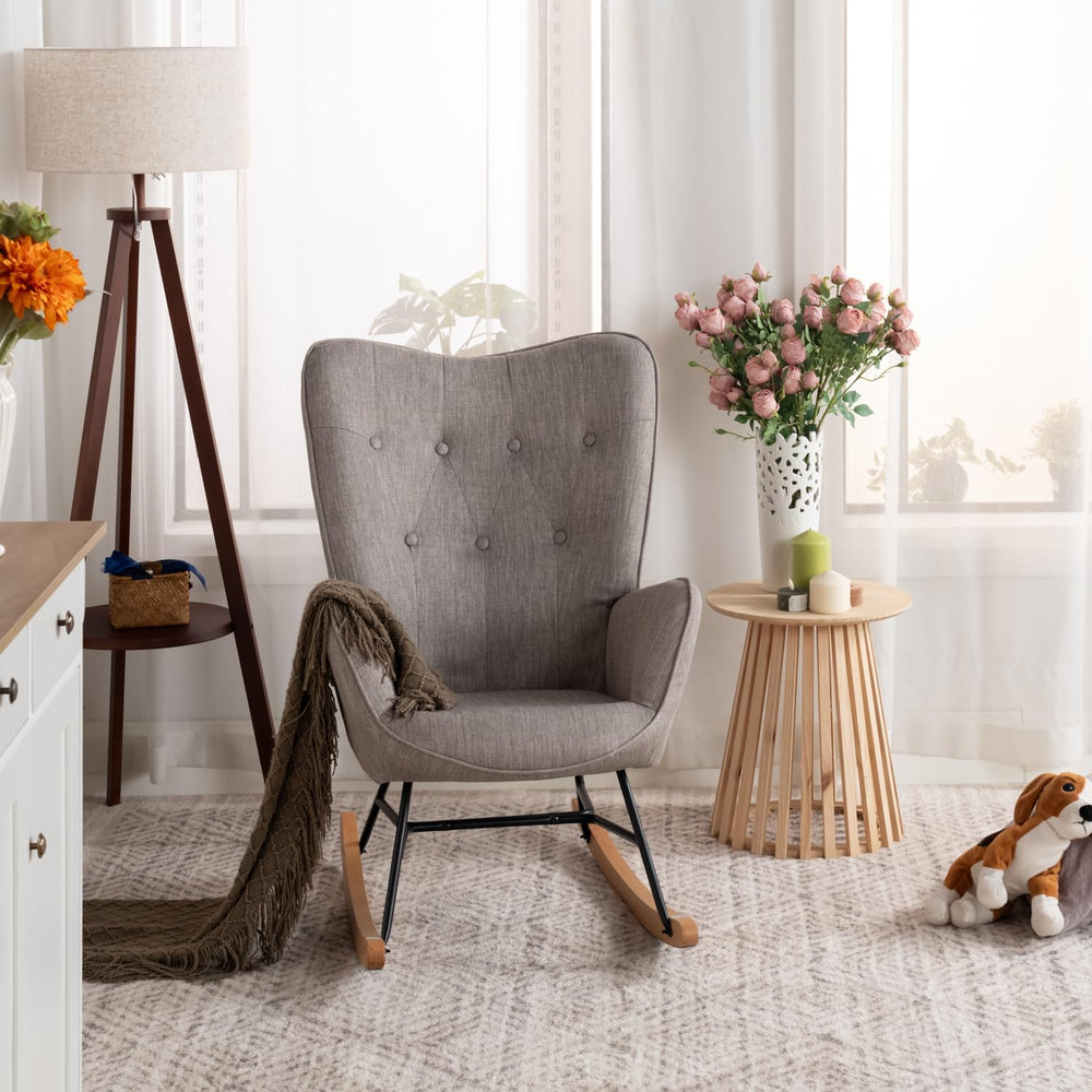 Dieser skandinavische Schaukelstuhl mit klarem und komfortablem Design passt sich stilvoll an verschiedene Räume in Ihrem Interieur an. Sein weicher Stoffbezug mit Armlehnen und seine kompakte Struktur auf Holz- und Metallbeinen machen ihn zu einem vielseitigen und eleganten Möbelstück, perfekt zum Entspannen, Arbeiten oder einfach zum Faulenzen, sei es im Schlafzimmer, Wohnzimmer, Büro oder sogar auf dem Balkon.
