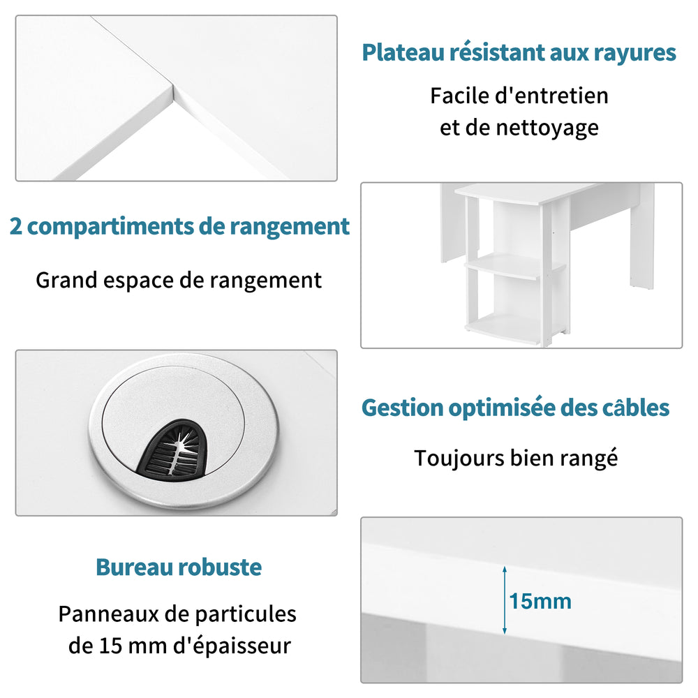 Eckschreibtisch L-forme 140x140x75 cm Computertisch avec 2 étagères, tabletop en contreplaqué blanc pour bureau à domicile