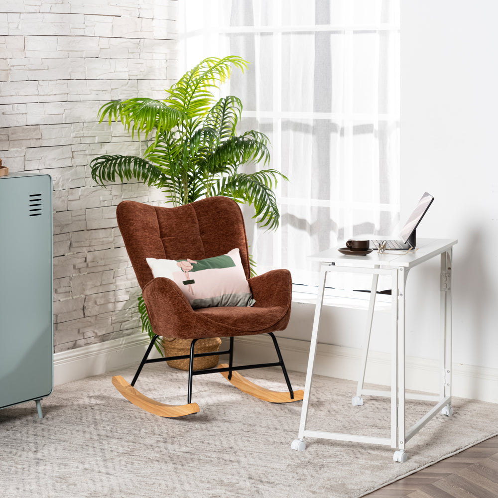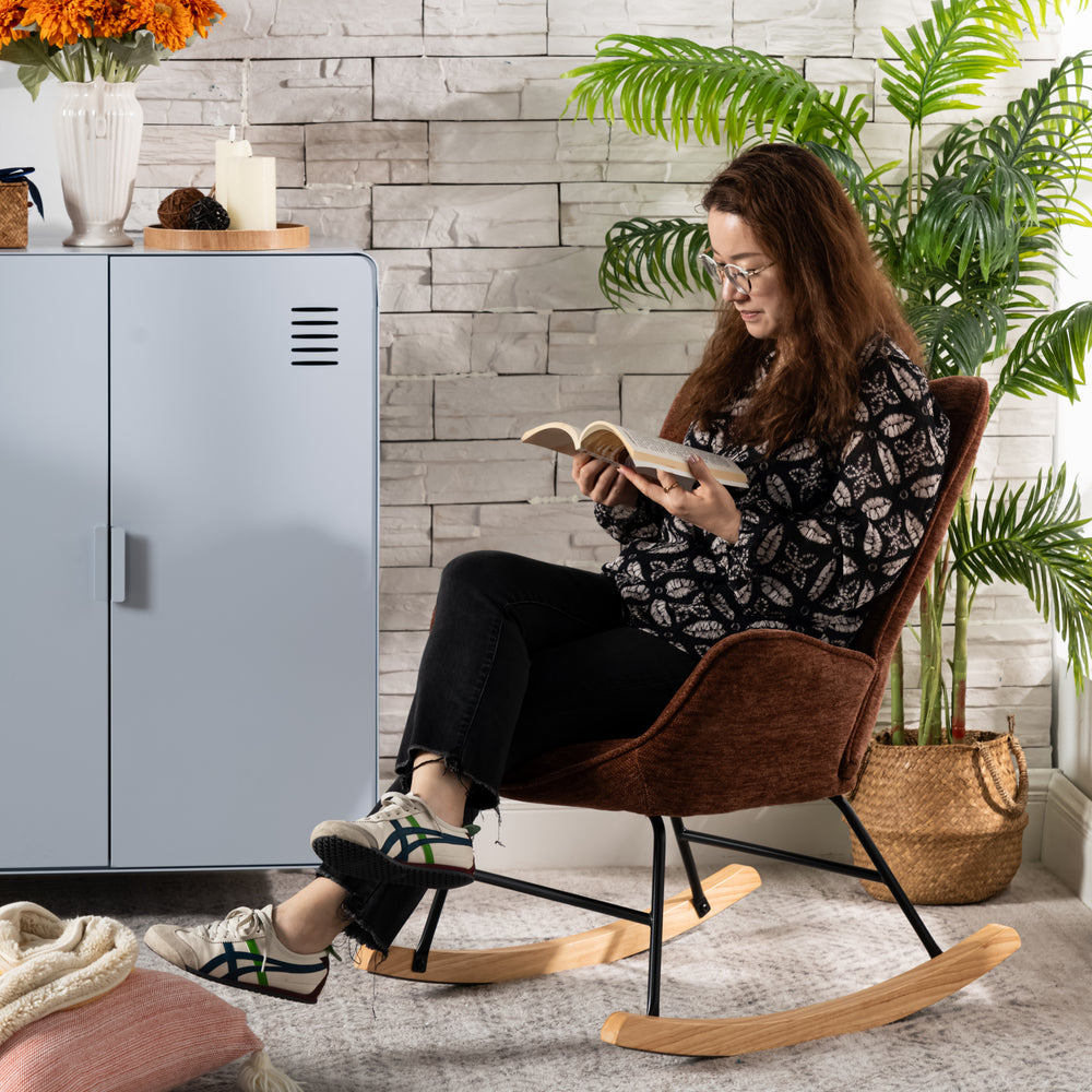 This Scandinavian rocking chair with its sleek and comfortable design will stylishly adapt to various spaces in your home. Its soft fabric upholstery with armrests and compact structure on wooden and metal legs will make it a versatile and elegant piece of furniture, perfect for relaxing, working or simply lounging, whether in the bedroom, living room, office or even the balcony.