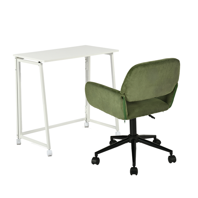 Bring a natural and trendy touch to your space with this compact and mobile set. The white folding desk is easy to move, while the ROSS chair in olive green corduroy guarantees comfort and style every day.