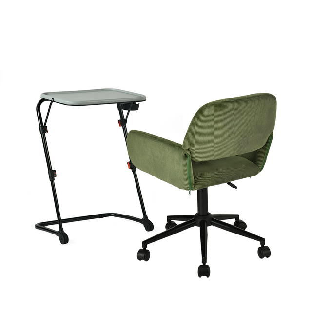 Create a stylish, multifunctional space with this stylish, mobile set. The ultra-practical BASELINE table pairs with the olive green corduroy ROSS armchair for a fresh, comfortable ambiance, ideal for both remote work and relaxation.