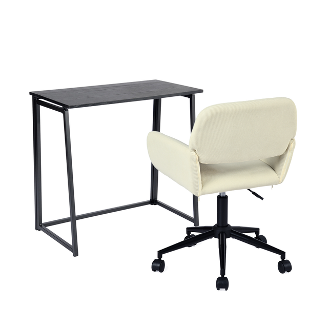 Combine industrial simplicity and Scandinavian softness with this set consisting of a black metal folding desk and a beige corduroy office chair. Ideal for small spaces, this practical and elegant duo fits equally well in an office, a bedroom, or a reading nook.