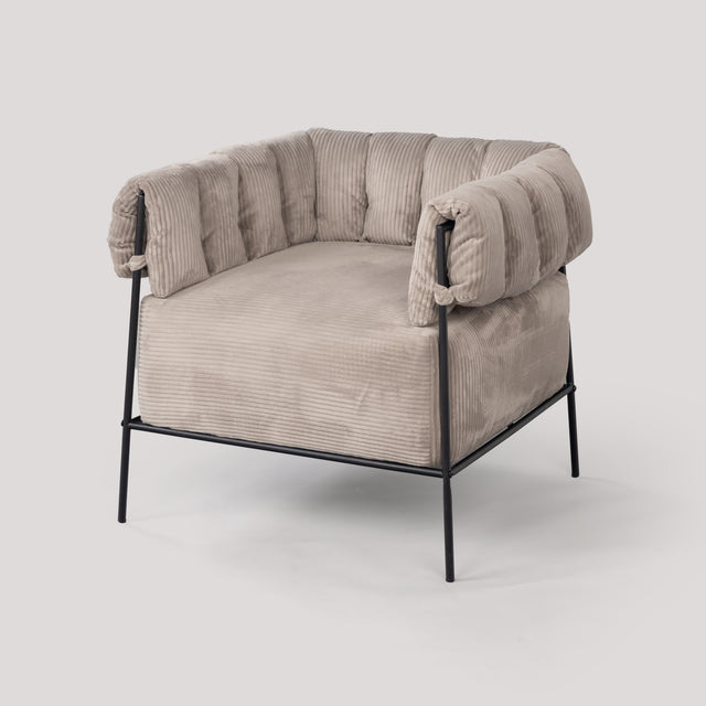 This lounge chair with its comfortable and sleek design will bring a touch of sophistication to your interior. Its light taupe corduroy upholstery and black metal frame offer a harmonious blend of industrial and modern style.
