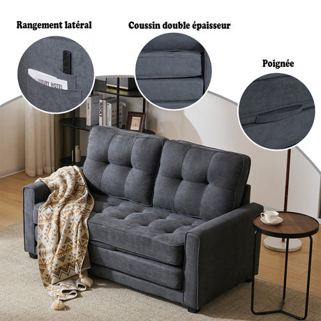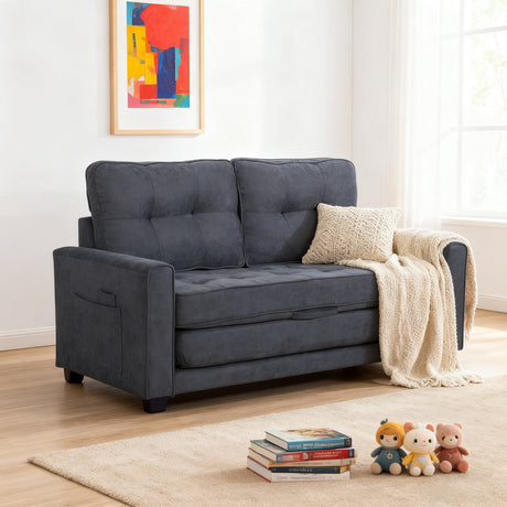 2-seater sofa bed in dark gray fabric with side pockets, modern convertible sofa