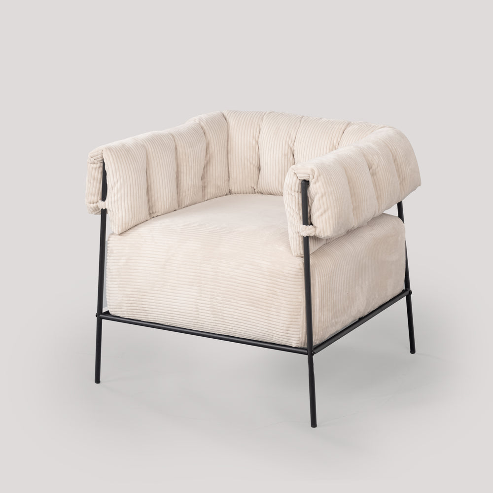 This lounge chair with its comfortable and sleek design will bring a touch of sophistication to your interior. Its beige corduroy upholstery and black metal frame offer a harmonious blend of industrial and modern style.